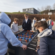 Seit ein paar Wochen nun stehen die beiden robusten Outdoor-Kickertische auf unserem Schulhof und erfreuen sich großer Beliebtheit. Kaum beginnt die Pause, schon bilden sich die ersten Trauben um die beiden Spielfelder.