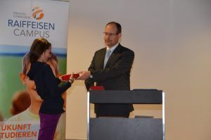 Schulleiter Meffert überreicht die Fairness-Preise an Mara (5a) und Nele (5b) sowie