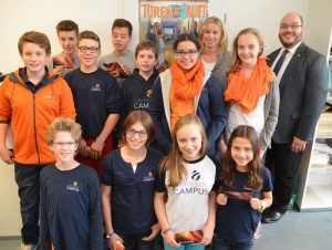 Fröhliche Beschenkte: Die elf Maustürentagsscouts in der Westerwaldbank mit SEB-Vorsitzender Frau Frischbier und Projektleiter Herrn Wagner