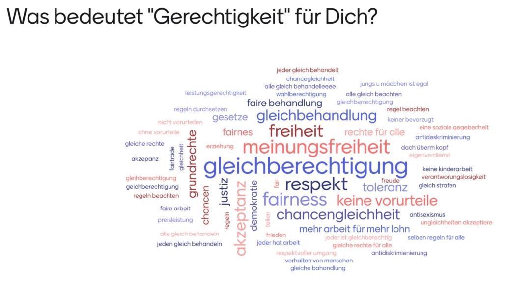Die Neuntklässler:innen beschäftigten sich im Religionsunterricht mit ihren Lehrkräften Matthias Brühl und Bernhard Meffert als Einstieg in die neue Reihe mit der Frage, was Gerechtigkeit für sie bedeutet. Und kamen ganz unbeeinflusst zu diesem Ergebnis, indem sie über Mentimeter ihre ganz persönlichen Assoziationen eintrugen und anschließend gewichtet (je mehr Nennungen des gleichen Begriff, desto größer im Druckbild) analysierten.