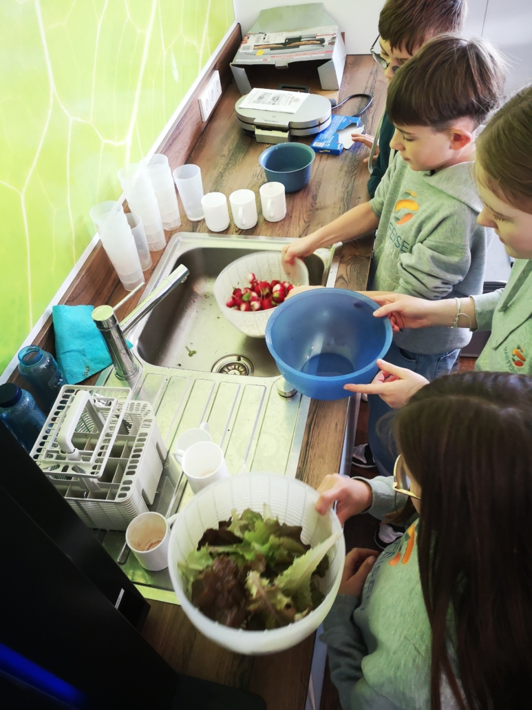Natürlich musste das frische Gemüse auch probiert werden! Gemeinsam wurde geerntet, gewaschen, geschnippelt und schließlich ein kleines Buffet für die ganze Gruppe zubereitet. Dabei kam der Spaß nicht zu kurz! Das Gefühl, die Früchte der eigenen Arbeit zu genießen, war einfach unbezahlbar.