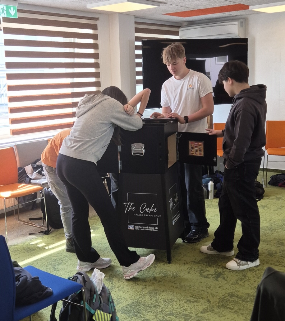 Ein besonderes Highlight war der anschließende Besuch der Zukunftsfiliale der Westerwaldbank in Bad Marienberg. Dort wurden die Schülerinnen und Schüler von Filialleiter Benjamin Brodt persönlich begrüßt und durch die modern gestaltete Filiale geführt. Neben spannenden Einblicken in den Bankalltag erklärte er auch die gestaltungstechnischen Besonderheiten der innovativen Filiale. In einer gemütlichen Lounge konnten sich die Gruppen zwischendurch austauschen und bei interaktiven Escape-Boxen ihr Teamwork unter Beweis stellen.