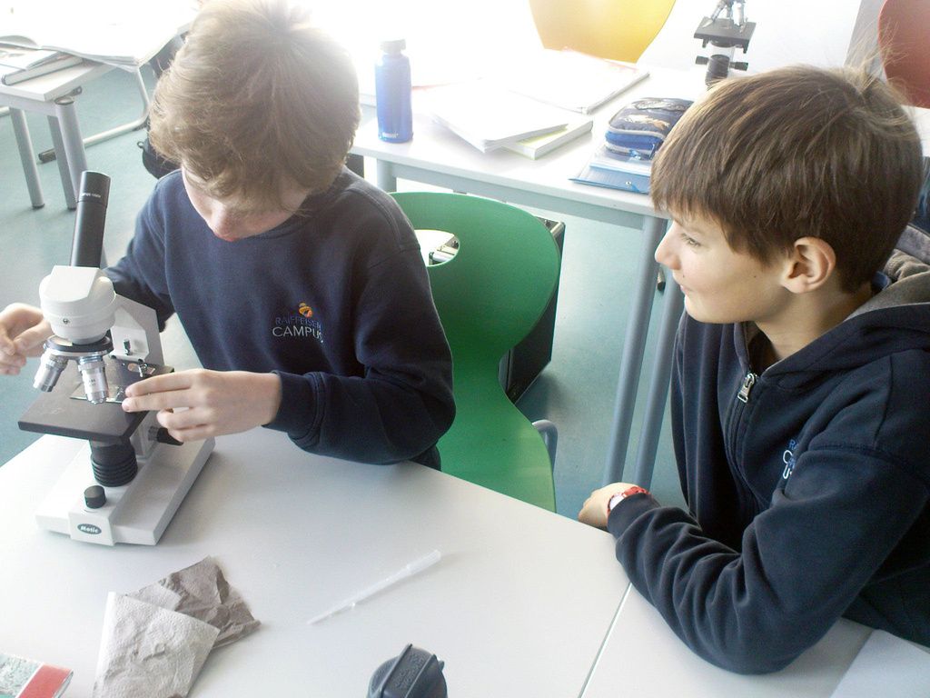 lul untersuchen von zu Hause mitgebrachten Sachen unter dem Mikroskop.